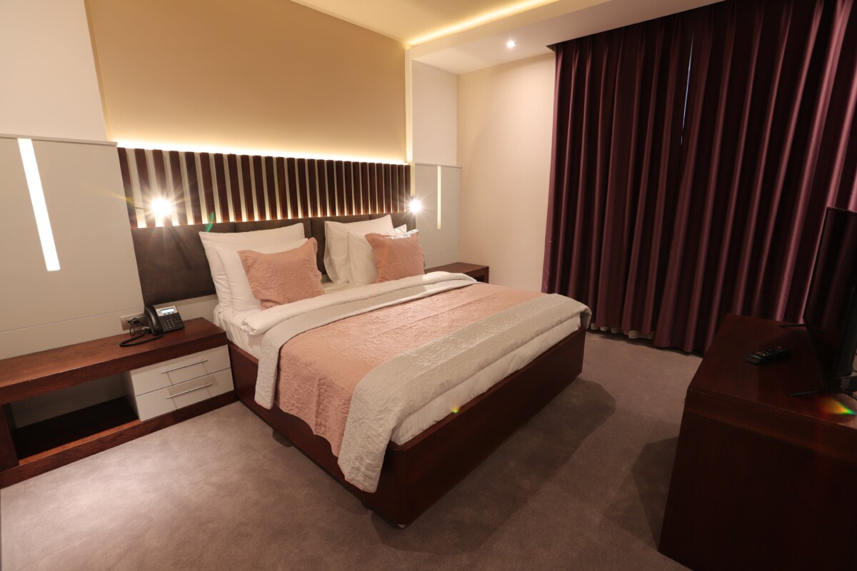 Furnished with king size bed ,Quality wooden furniture , a big modern bathroom, Free internet access,Flat screen TV with multilingual channels , Central air conditioning ,security safe and a minibar.
